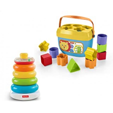 Little ones will have a blast with this exciting gift set, which features two iconic Fisher-Price toys! Little hands will love grasping, holding, shaking and stacking the five colorful rings of the classic Rock-a-Stack toy, with its wobby base that rocks when your baby bats at it. The fun keeps building up with Baby's First Blocks, as your baby sorts the shapes into the bucket, and then dumps the bucket to see all the colorful blocks come tumbling out—over and over again. With all the bat-at play and shape-sorting fun, your baby will be busy as a bee developing fine motor and problem solving skills! Where development comes into play Fine Motor: Little hands get a big workout as they grasp and interact with the rings and blocks, helping to foster hand-eye coordination and dexterity. Problem Solving: Your baby will exercise big thinking skills as they use trial and error to sort the shapes into the correct slots and stack the rings from biggest to smallest.