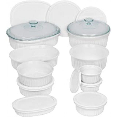 The CorningWare French White Bakeware Set contains 20 pieces total, and includes one each of the following: a 2.5-quart oval with glass lid, 1.5-quart oval with plastic lid, 2.5-quart round with glass lid, 1.5-quart round with plastic lid, 15-ounce oval with plastic lid, 15-ounce round with plastic lid, 16-ounce oval with plastic lid, and 16-ounce round with plastic lid. The set also includes two each of the following: 24-ounce round with plastic lids, and 7-ounce ramekins with plastic lids. CorningWare oven-to-table bakeware and glass lids are both versatile and stylish; just bake and serve in one dish. The set's BPA-free plastic lids help keep food fresh. Each piece is made of durable stoneware material that resists chipping and cracking and features a high-gloss exterior that is non-porous, easy to clean, and won't absorb flavors, odors, or stains. CorningWare bakeware is oven (pre-heated), dishwasher, refrigerator, freezer, and microwave safe. Bakeware and glass lids come with a 1-year limited warranty. Plastic lids come with a 2-year limited warranty against manufacturer defect.Dishes resist stains and do not absorb food odors or flavors